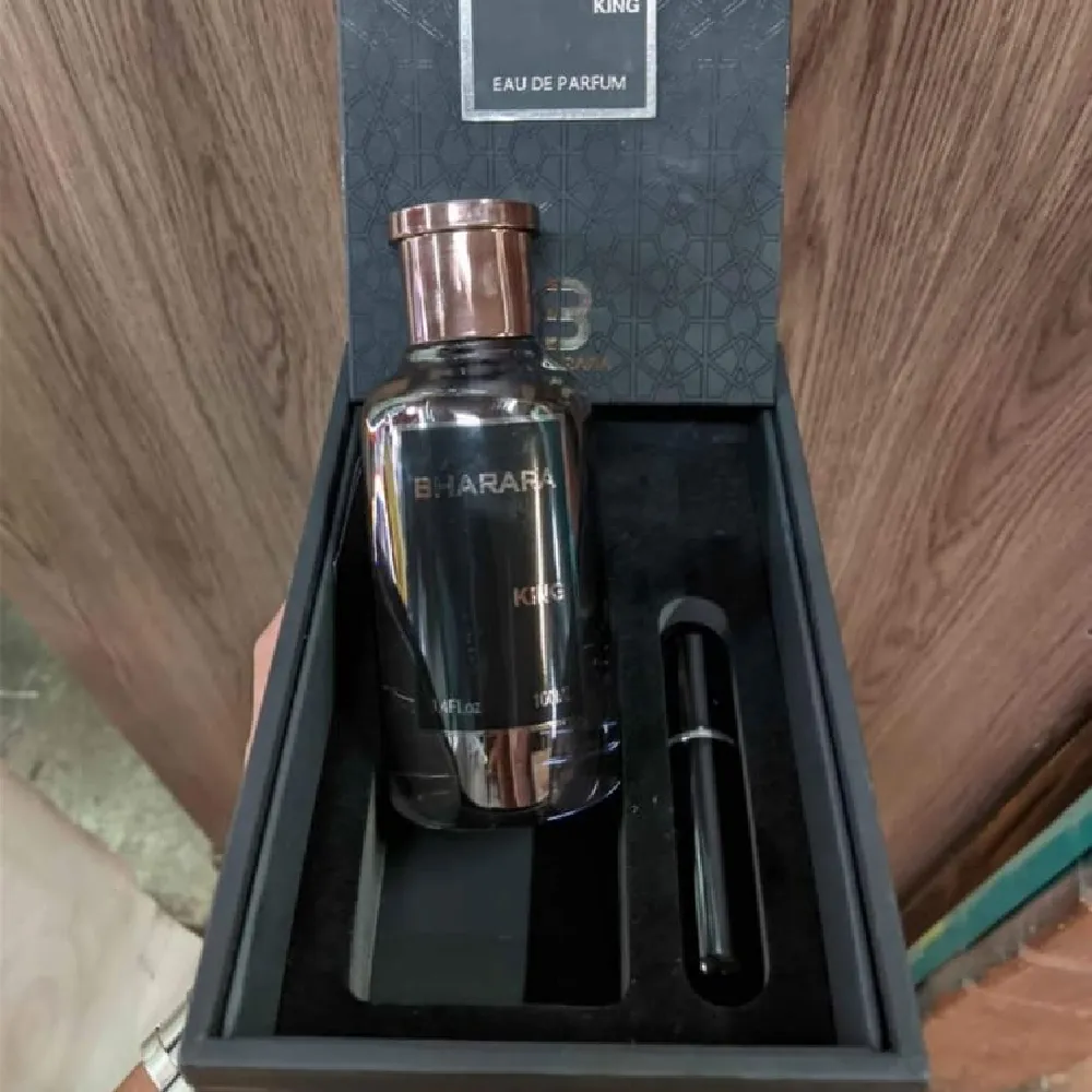 Bharara King (EDP, 2021) es un perfume de estilo cítrico–frutal dulce con fondo ambarado y almizclado, pensado para llamar la atención sin oler pesado. Abre con un golpe muy jugoso de naranja, bergamota y limón: cítrico brillante, tipo “cáscara recién exprimida”, con sensación limpia y energética. A los minutos aparece un corazón tutti-frutti (frutal dulce, tipo mix de frutas) que le da un aire más “moderno” y un poco goloso, pero sin llegar a caramelo.