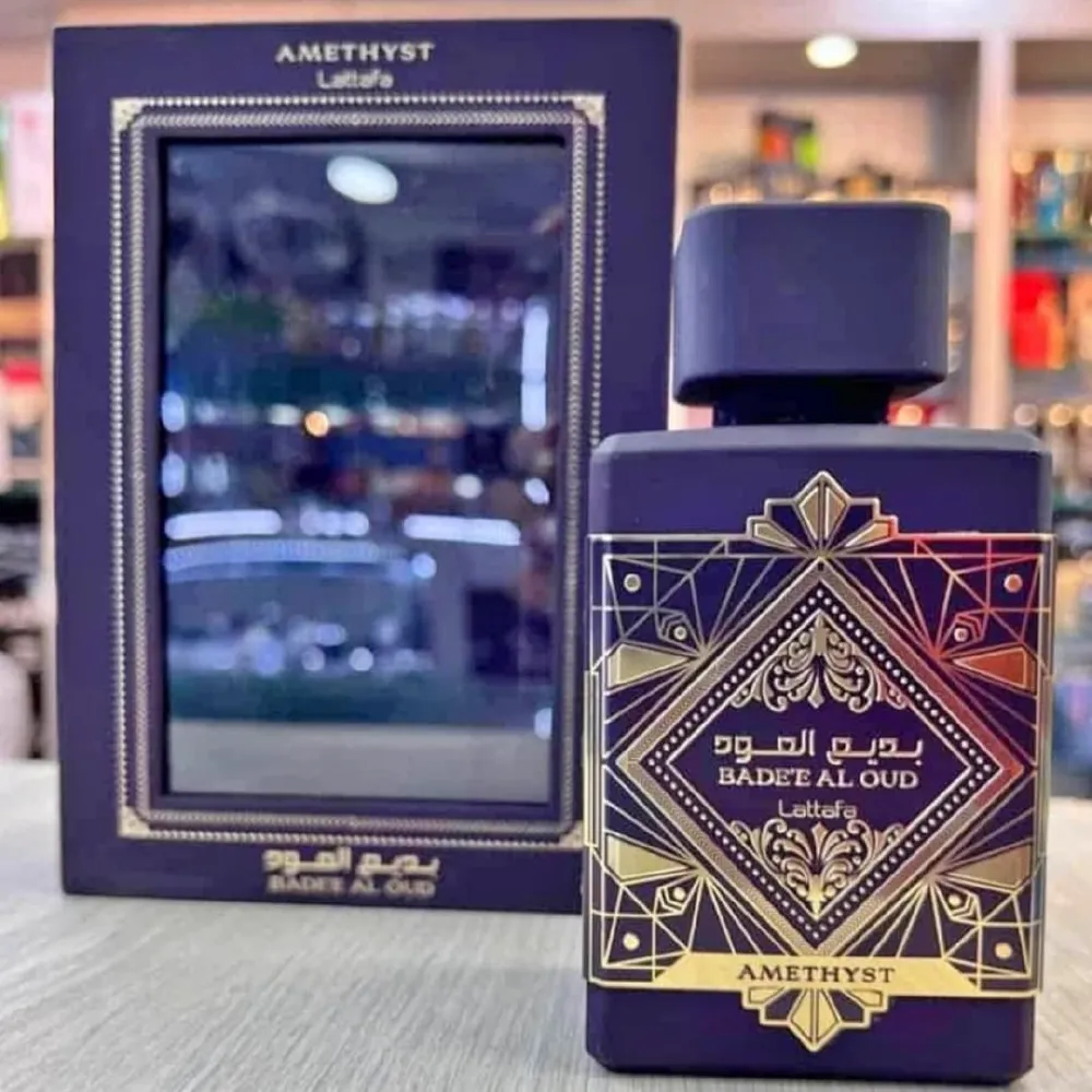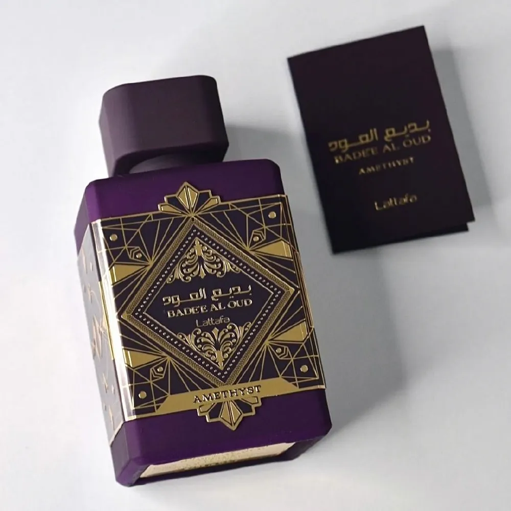 Lattafa Amethyst (Bade’e Al Oud Amethyst, EDP unisex) es una mezcla rosa + oud con vainilla, intensa y muy “de noche”. Abre con bergamota fresca y pimienta rosa picante, que le da un inicio brillante pero con carácter. Luego entra un corazón floral potente: rosa turca, rosa búlgara y jazmín, una rosa madura y elegante, nada ligera.